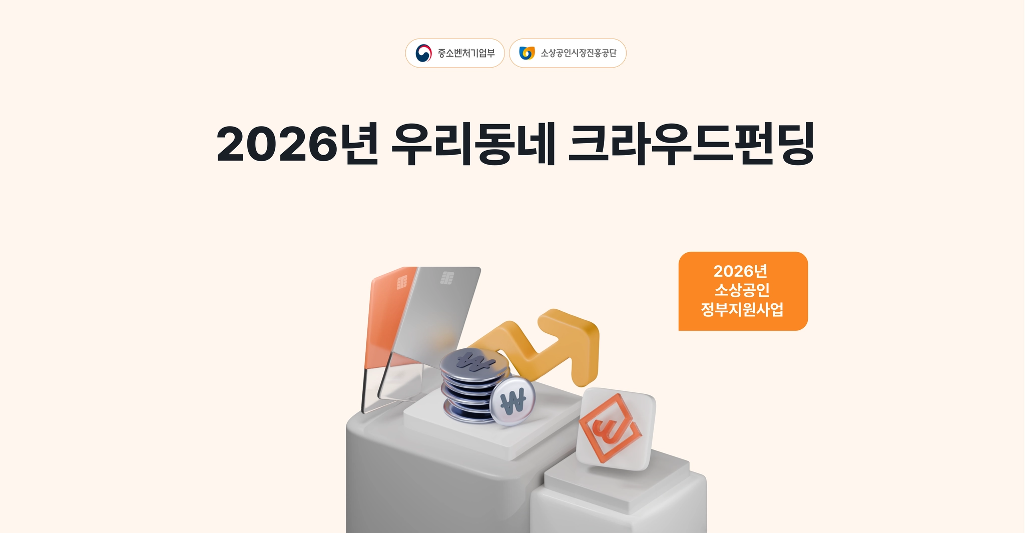 2026년 우리동네 크라우드펀딩 지원사업은 소상공인진흥공단과 윙크스톤파트너스가 함께합니다.